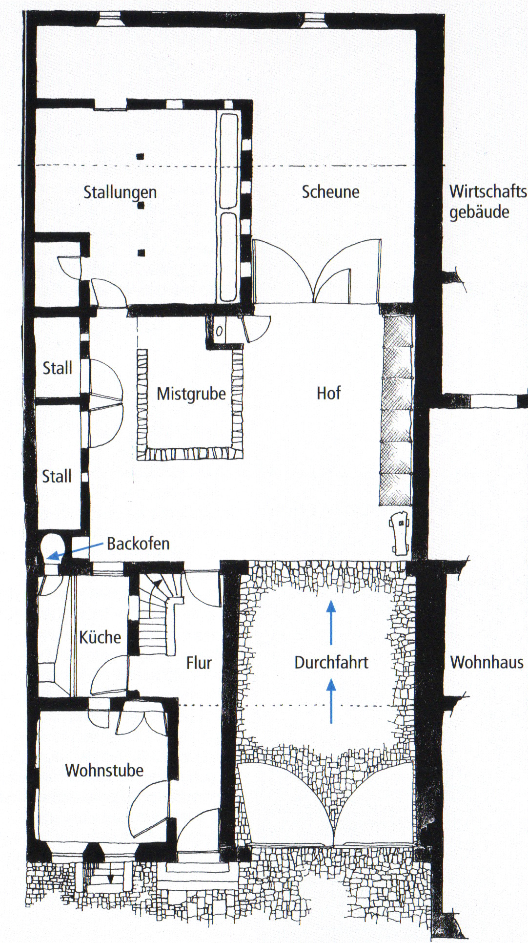 An der Zuordnung der Raumnutzung wurde dabei nichts verändert. Die Scheuneneinfahrt befand sich in der Verlängerung der Toreinfahrt des Vordergebäudes und verfügte im Inneren über eine hölzerne Dreschvorrichtung mit Göpelantrieb. Daneben mit vorgelagerter Mistkaue befanden sich die Stallungen mit darüber liegender Scheune. Flankierend zum linken Nachbarn waren ebenfalls Wirtschaftsgebäude für Kleinvieh zum Wohngebäude hin angesiedelt. Die Auswertung der nun erhaltenen Informationen sowie die Vergleiche zu anderen zeitgenössischen Wirtschaftsgebäuden lassen es zu, das ursprüngliche Erscheinungsbild des Wirtschaftstraktes im 18. Jahrhundert entsprechend der Zeichnung von Axel C. Gross darzustellen.
