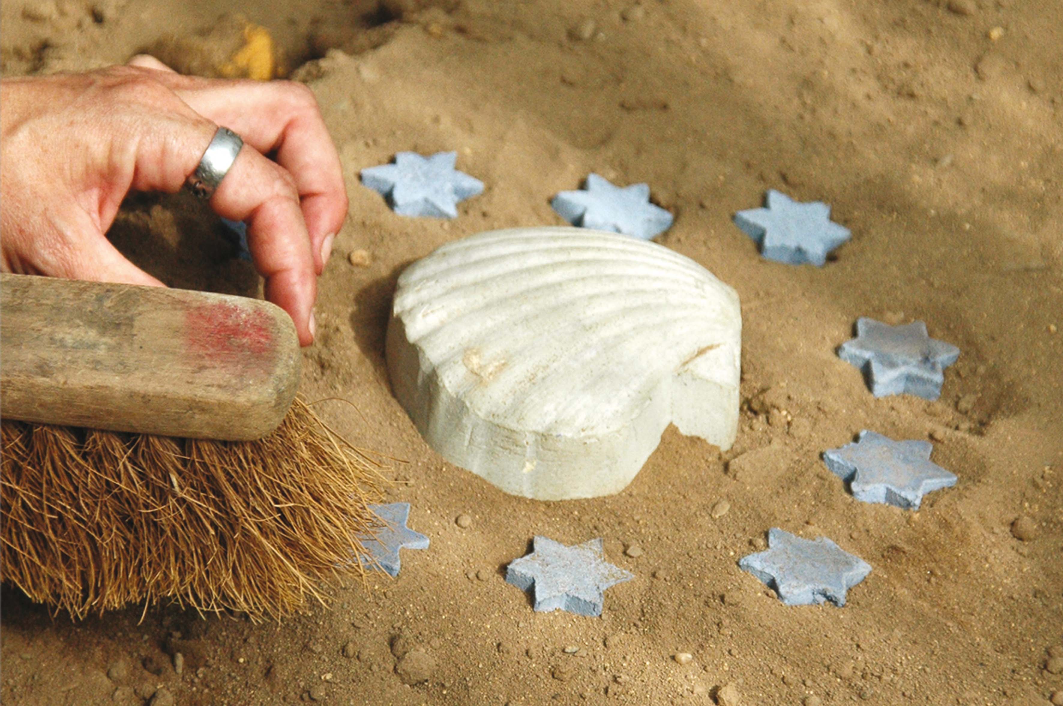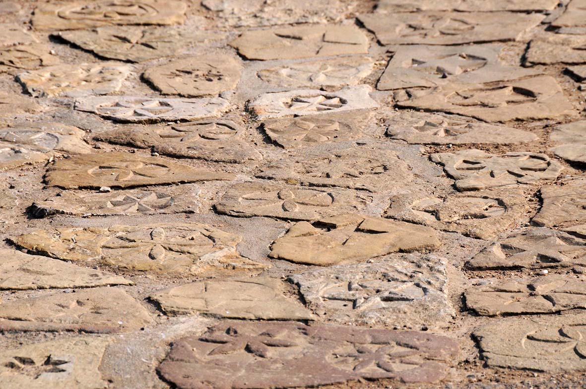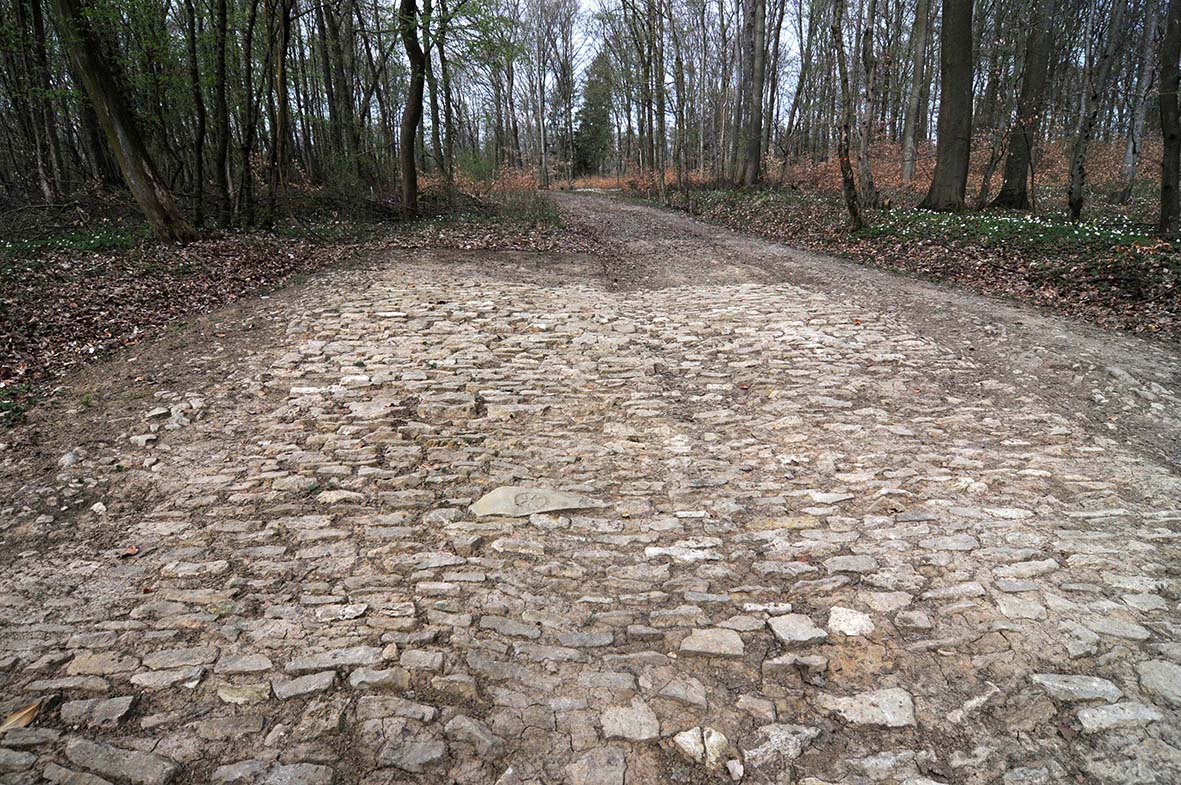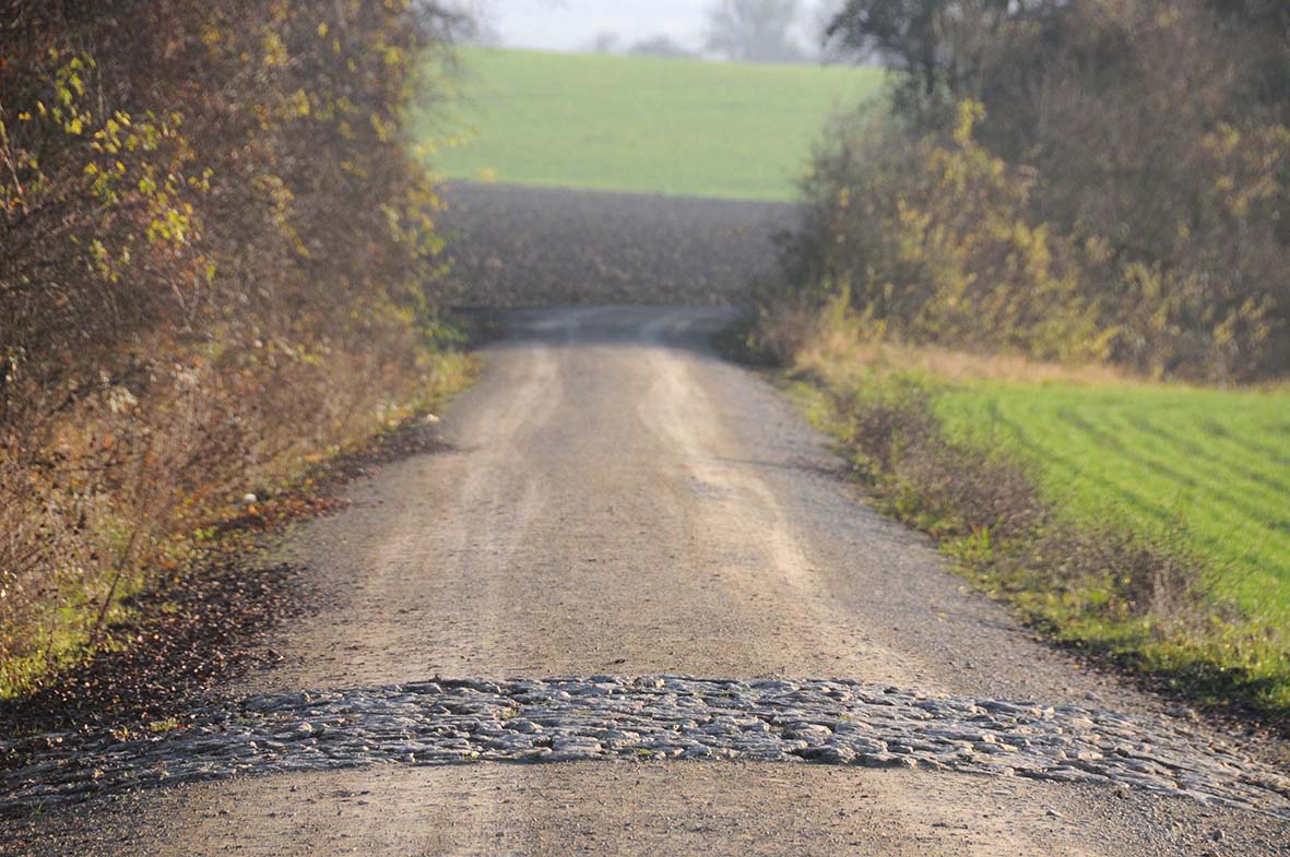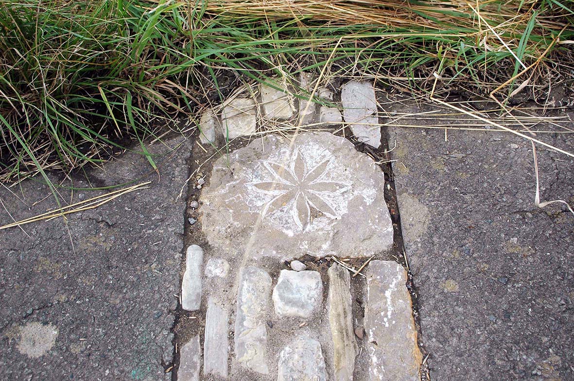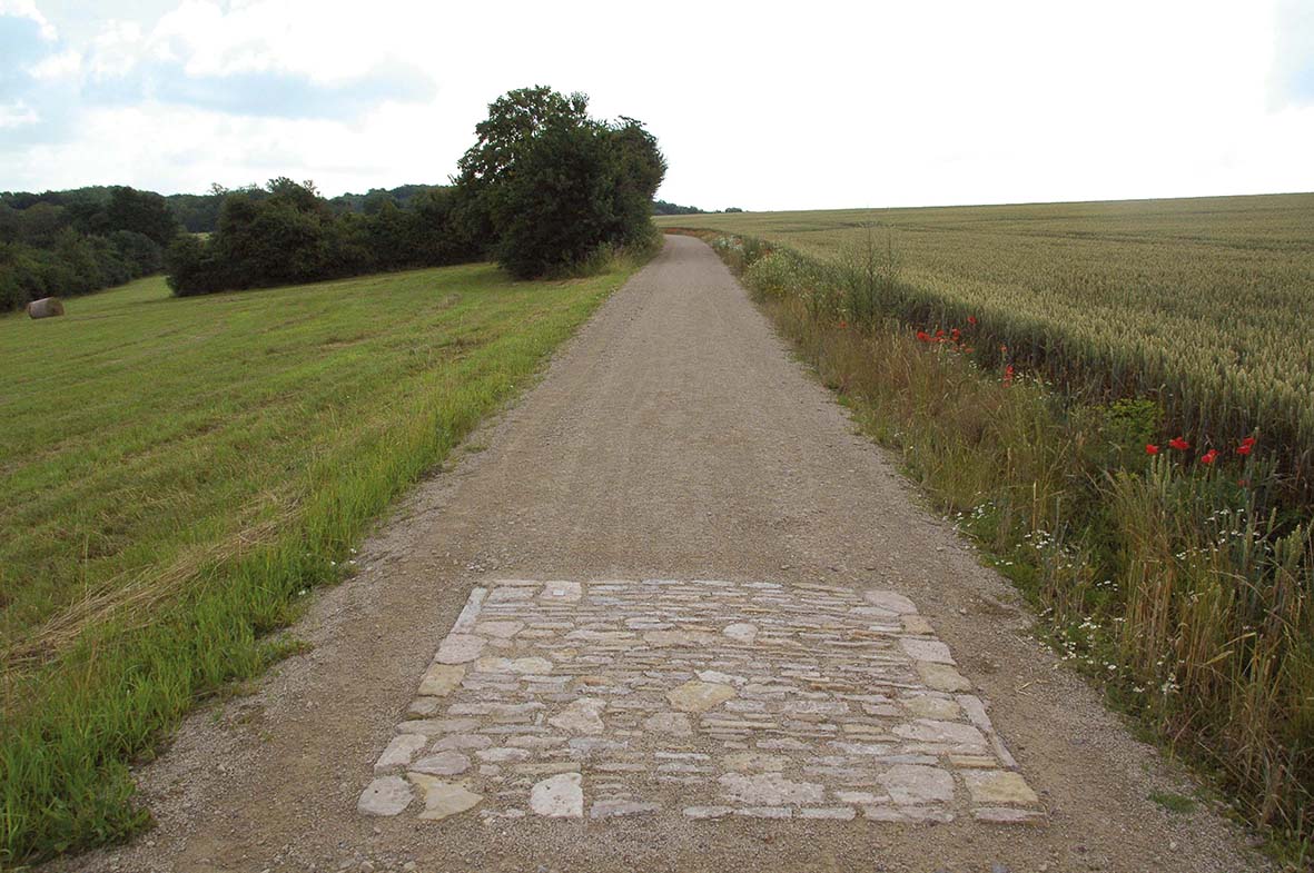 Die „Bodenzitate“ aus Feldsteinen erinnern an die alten Wegebefestigungen, die in dieser Kulturlandschaft traditionell als Steinstickungen aus Muschelkalksteinen gefertigt wurden. Man findet sie oberhalb von Bliesransbach vor dem Abzweig in Richtung Gut Hartungshof, ein zweites „Bodenzitat befindet sich auf dem Dragonerweg auf dem Höhenzug hinter Gut Hartungshof. Nimmt man den Weg über den Wintringer Hof entdeckt man im Wald ein Stück eines freigelegten historischen Wegestückes, das wohl ursprünglich zum Wintringer Hof führte, und heute mit dem eingelassenen Stern von Güdingen die Pilger begrüßt.