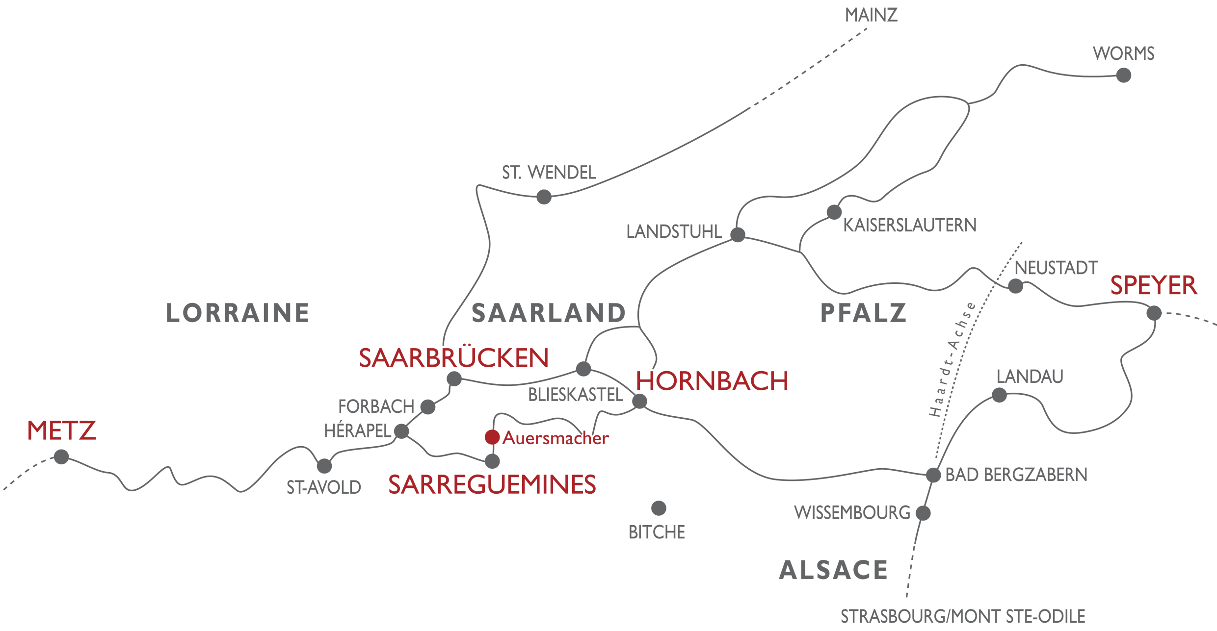 Gehen Sie auf Spurensuche und entdecken Sie auf einem Teilstück der Saarland | Südroute: Hornbach – Saarbrücken/Sarreguemines – Metz den Geist einer europäischen Kulturstraße in der Gegenwart!