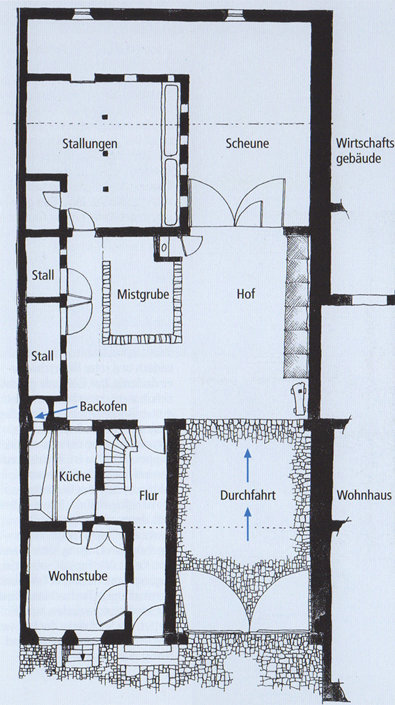 Diese Enge und möglicherweise die Einbeziehung der Rese eines Vorgängerhauses war eine Herausforderung für die Erbauer und verlange geschickte Lösungen, um den landwirtschaftlichen Funktionsablauf zu gewährleisten. Im Gegensatz zu den klasssichen Quereinhäusern ist das "Alte Bauernhaus" deshalb in zwei Baukörper - Wohngebäude und Wirtschaftsgebäude - in die Tiefe gegliedert und hatte damit einen ganz eigenen Charakter.