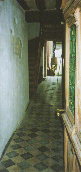 Das Erdgeschoss wird durch einen durchlaufenden Hausflur zur Rückseite hin erschlossen. Vom Flur zweigt links der Zugang zur Wohnstube ab. Ein Stück weiter, unmittelbar vor der hölzernen Treppe, die zum Obergeschoss führt, zweigt der Eingang zur Küche ab.