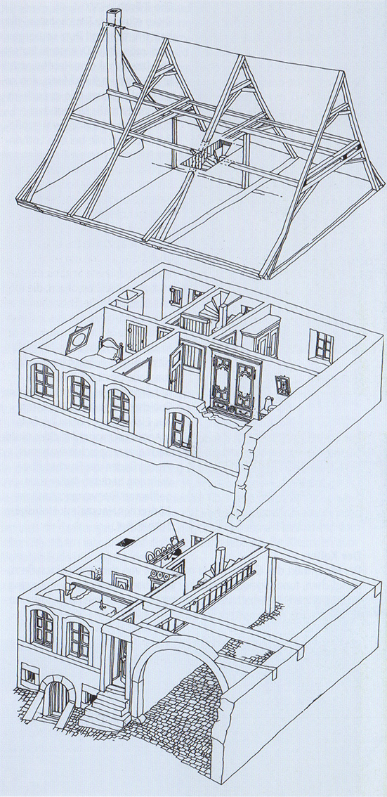 Die Decken des gesamten Gebäudes waren ursprünglich als Stroh-/Lehmwickeldecken ausgeführt, die heute zum überwiegenden Teil noch vorhanden und erkennbar sind. Die hölzernen sehr qualitätsvoll ausgeführten Fenster stammen aus der Jahrhundertwende und waren wohl ursprünglich zweiflüglig mit jeweils zwei Sprossen je Flügel ausgeführt. Zur Küche bestand urspünglich kein Durchgang. Reste einer Sandsteinumrandung deuten darauf hin, dass hier eine Art Durchreiche zur Küche vorhanden war. Vor der daneben angesiedelten größeren Mauerwerksnische war urspünglich ein Wandschrank vorgeblendet.